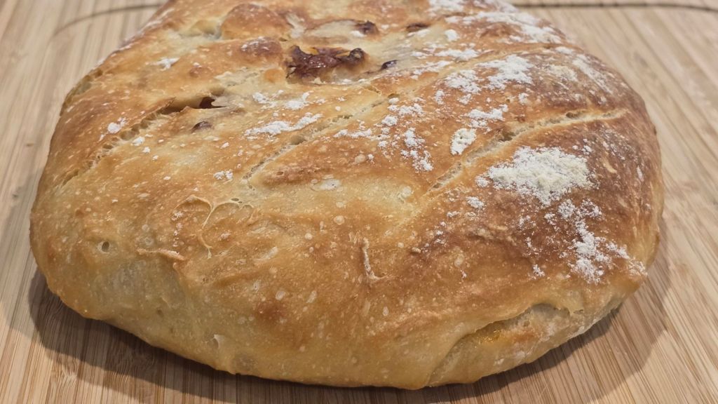Bake 15 min covered at 220 °C / 425 °F, then remove the lid and bake another 15-20 min until deep golden and the bottom sounds hollow.