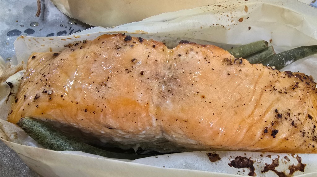 Fold small squares of baking paper into little pouches and tie each corner with oven-safe string. Gently open the center and add your favourite veggies – I used green beans for this one. Place a salmon fillet on top, season with salt, pepper, lemon juice, and a good drizzle of olive oil. Then bake in the oven until it’s tender and full of flavour.