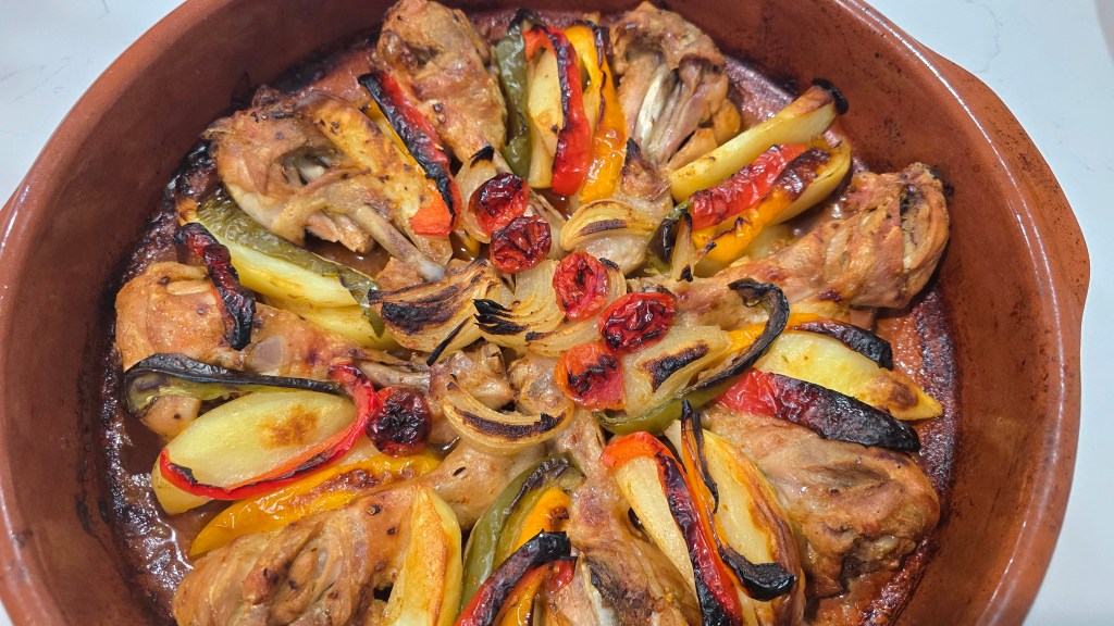Crispy outside, juicy inside, and baked with potatoes, sweet peppers, and tomatoes.