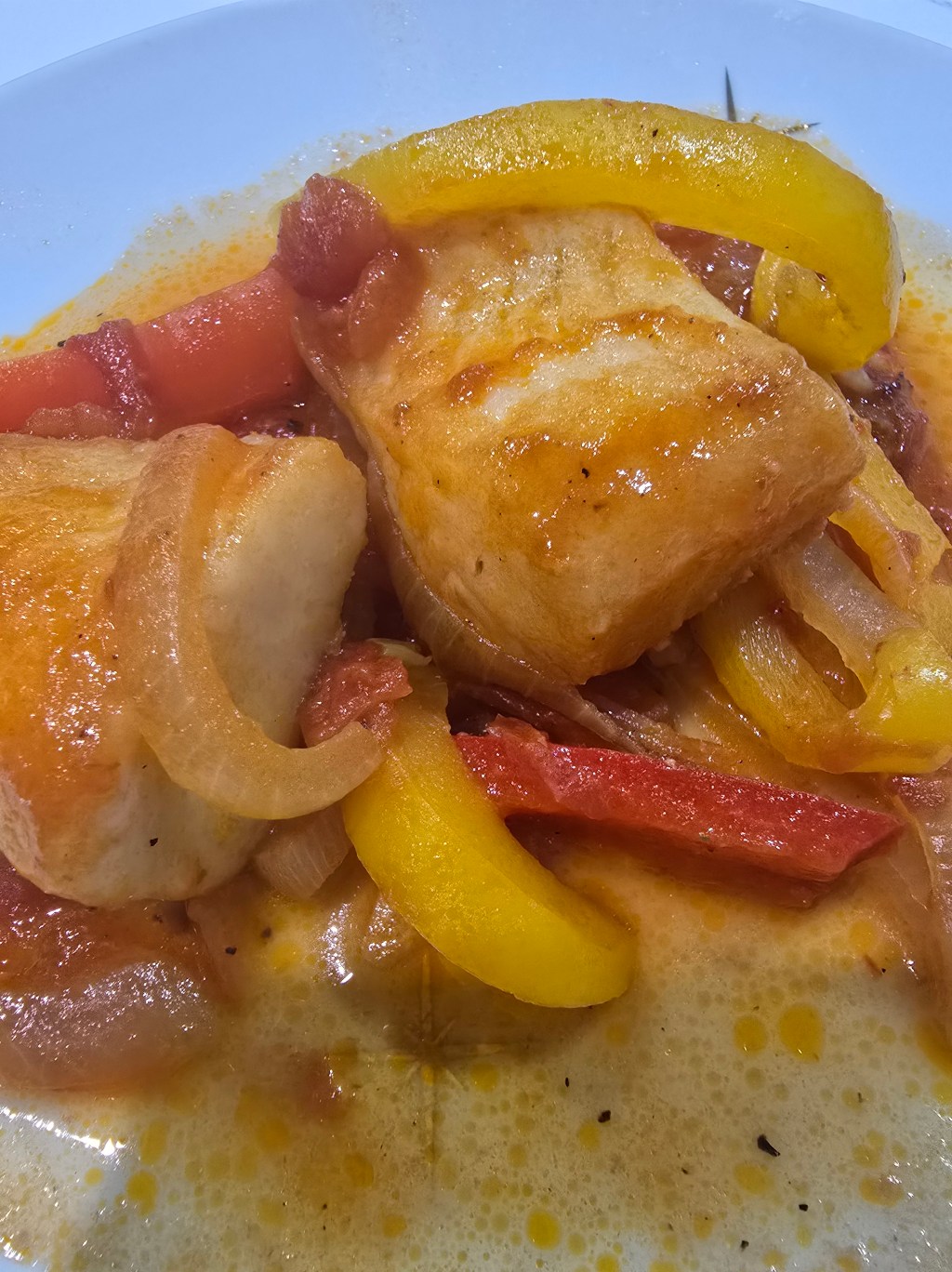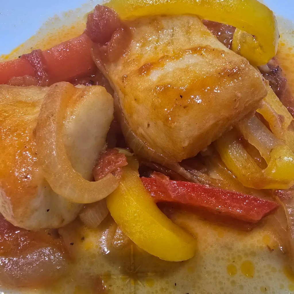 Add olive oil to a pan and sliced onion in half-moons. Add chopped garlic. Keep the heat low so it doesn’t burn. When the onion turns translucent, add chopped tomatoes (I used canned). Pour in a splash of water and let it simmer. Add sliced yellow and red peppers. Season with salt and pepper. Place the fish fillets on top, cover, and let them cook through. Serve hot with rice or a fresh salad.